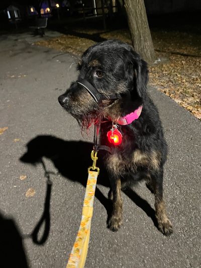 Does your dog like to go on walks? Yes, she loves walks and can easily do 7+ km a day. Going on walks is a part of her new daily routine. She is working on walking with a loose leash and passing other dogs less excitedly. A headcollar/halti for walks is recommended.